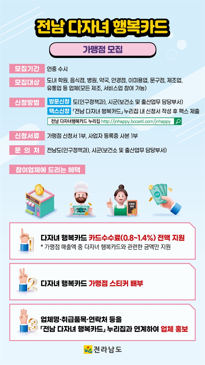 ‘전남 다자녀행복카드’는 막내가 18세 이하인 2자녀 이상 가정에 발급되는 카드로, 교육비, 의료비, 주유비, 외식비 등 일상생활 전반에서 다양한 할인 혜택을 제공한다.