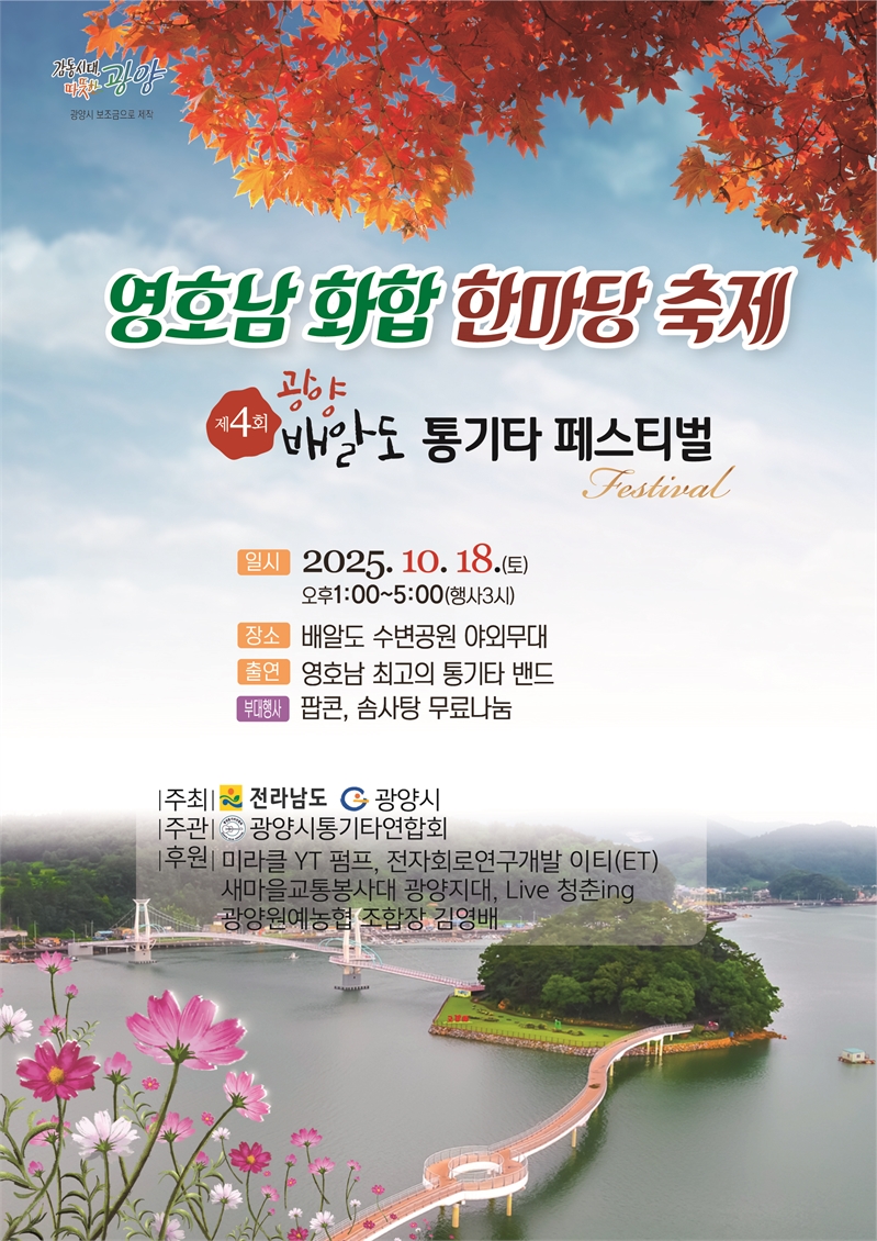 오는 10월 18일 오후 1시부터 5시까지 광양시 배알도 수변공원 야외무대에서 제4회 광양 배알도 통기타 페스티벌이 영·호남 화합 한마당 축제로 열린다.