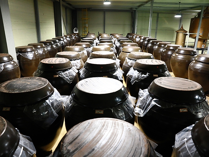 발효 매실 증류주 백자라인이 숙성되고 있는 항아리(사진:전현숙 기자)