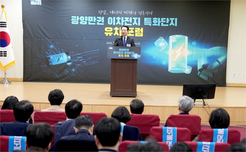 전라남도가 22일 국회의원회관에서 ‘광양만권 이차전지 특화단지 유치 포럼’을 열고, 광양만권을 K-배터리 공급망의 핵심 거점으로 육성하기 위한 전략과 과제를 논의했다. 포럼에는 김영록 전남도지사와 권향엽 더불어민주당 국회의원, 정인화 광양시장을 비롯해 지자체 관계자, 기업, 대학·연구기관 전문가 등이 참석했다.