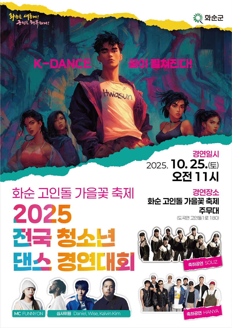 화순군이 제2회 화순군 전국 청소년 댄스경연대회 본선을 오는 10월 25일(토) '2025 화순 고인돌 가을꽃 축제 주무대에서 개최한다. 화순군은 지난 9월 1일부터 28일까지 대회 참가자 모집해 전국 각지의 재능 있는 청소년 댄스팀 37개 팀이 예선에 접수했으며, 9월 30일 동영상 예선 심사를 거쳐 최종 15개 팀