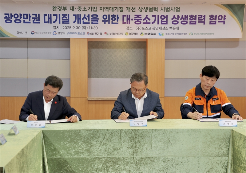 광양시와 영산강유역환경청이 9월 30일 국내 최대 철강업체인 ㈜포스코 광양제철소, 협력업체 4개사와 광양만권 지역 대기질 개선을 위해 ‘광양만권 대․중․소기업 지역 대기질 개선 상생협력 협약’을 체결했다. 이번 협약은 정부·지자체·대·중소기업이 협력해 중소기업의 노후 대기방지시설 교체 등을 지원하는 ‘대·중소기업 지역
