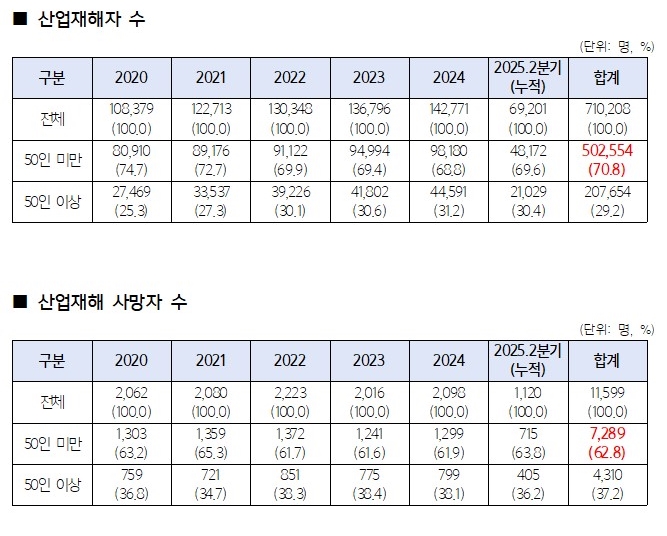 더불어민주당 권향엽 국회의원(순천광양곡성구례을·산업통상자원중소벤처기업위원회)이 2020년부터 2025년 2분기까지 6년간 산업재해자 수가 71만 명, 산업재해 사망자 수는 1만1599명에 달한다고 29일 밝혔다. 산업재해자 중 71%(50만 명), 사망자 중 63%(7289명)는 50인 미만 사업장에 속한 것으로 나타