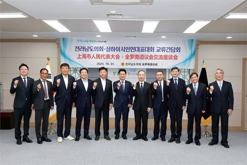 전라남도의회가 10월 31일 오전 도의회에서 중국 상해시 인민대표대회 대표단을 공식 접견하고, 양 지역 지방의회 간 우호교류와 협력 방안을 논의했다. 이번 방문은 전라남도의회와 상하이시 인민대표대회 간 첫 공식 교류로, 상하이시 인민대표대회 상무위원회 농업농촌위원회 임결(林杰) 주임을 단장으로 한 5명의 대표단이 전라