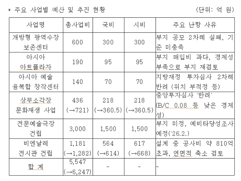 광주시가 추진 중인 대형 문화 인프라 사업들이 부지 미확보와 중앙심사 반려, 경제성 부족 등으로 잇따라 제동이 걸리고 있으며 사업비는 눈덩이처럼 불어나지만, 사업 추진은 제자리 걸음이라는 지적이다. 12일 열린 문화체육실 행정사무감사에서 정무창 의원(더불어민주당·광산2)은 “광주시가 추진 중인 6개 핵심 문화사업이 모