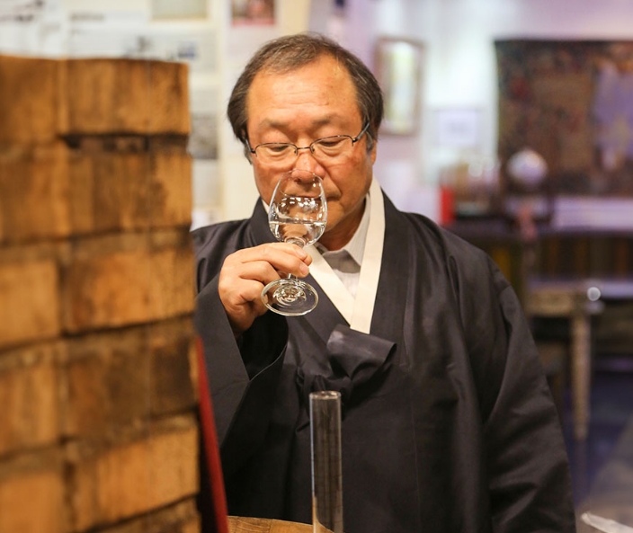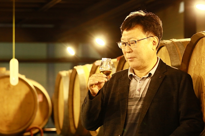 오규식 ‘섬진강의 봄’ 부사장이 오크통에서 숙성된 증류주를 시음하고 있다.(사진:전현숙 기자)